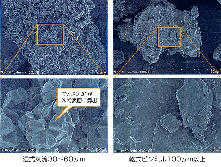 ・従来の製粉法(スタンプミル、石臼、ピンミル) 硬さが違うもの同士をぶつけ合い、物理的に粉砕するため、熱が発生し易く、粒度分布が広い。・気流粉砕法 同じ硬さの素材(米粒)同士がぶつかり合って粉砕されるため、衝撃が小さく、熱の発生量が低い。 また、設定粒度まで気流粉砕機内に滞留し続けるため、細かく、粒度分布の幅が狭い粒度が揃った微細粉になる。・更に「湿式」にすることで、素材が柔らかくなり、熱の発生量をより低く抑える事ができる。・熱の発生量を抑えることで、米のアルファ化を防ぎ、「でんぷん」の損傷率を低くする事ができる。